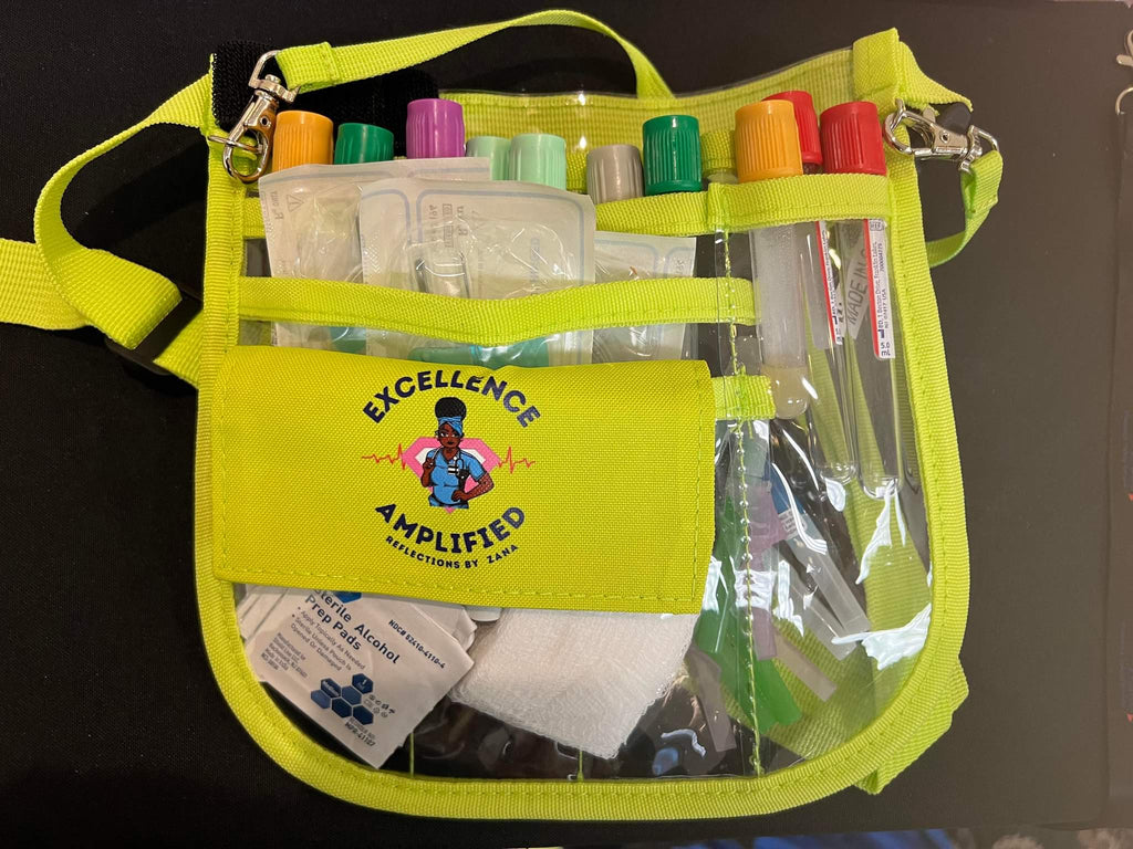 Fanny pack with phlebotomy tools to help you continue to practice venipuncture methods.